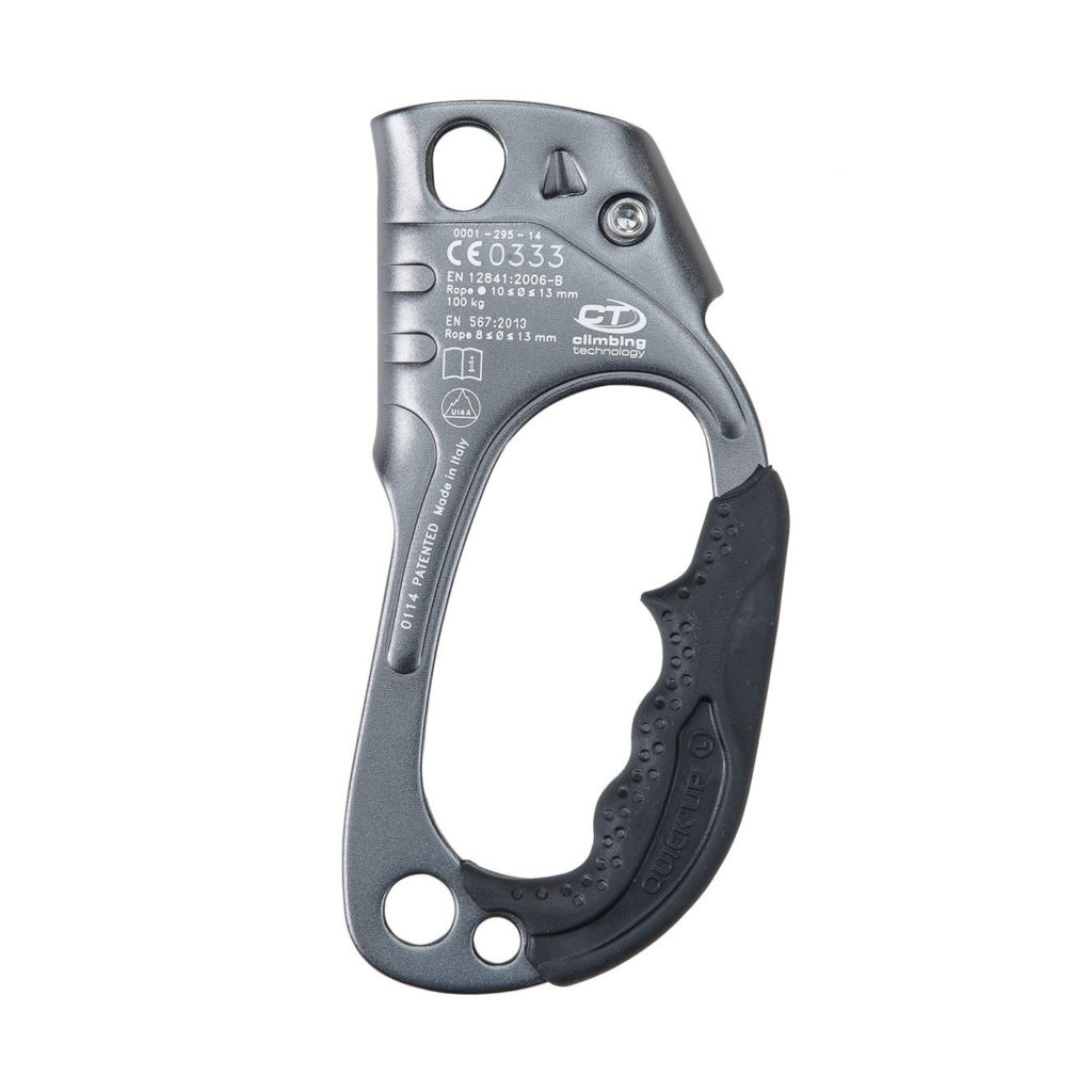 Lewa strona srebrnego przyrządu zaciskowego małpa Quick Up z widocznymi oznaczeniami