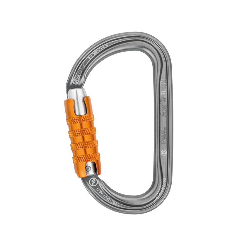 karabinek w kształcie litery D z pomarańczowym zamkiem typu Triact marki Petzl AMD